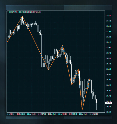 連續的更低的頂部(或波峰)和更低的底部(或波谷)形成的形態為下行趨勢。在這種趨勢中,供應超過需求,支撐位不能承受住拋盤壓力。這樣,價格跌破支撐位,在圖表上錄得更低的低點。