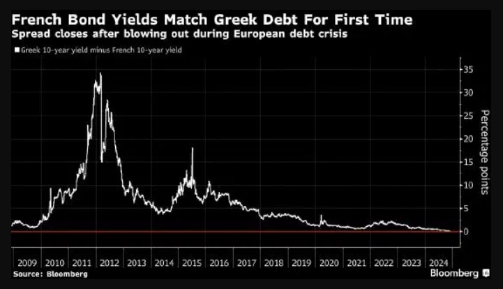 法國、希臘10年期公債息差抹平來源:彭博